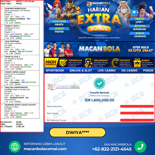 Berhasil menang besar pada Parlay dengan kemenangan Sebesar Rp. 1.502.100,-. Setelah mengisi form withdraw dengan kurung waktu hanya 1 - 3 menit sudah melakukan transfer kepada pemilik User id dan dana sudah masuk ke rekening pemenang. Bukti pembayaran yang kami berikan merupakan bukti pembayaran yang SAH yang langsung di dapatkan melaui tanda bukti transaksi dari Bank tujuan.